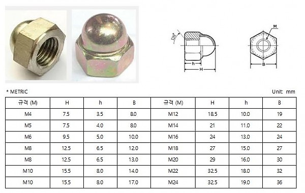 캡너트 페이지 정보 글쓴이 관리자 작성일2014-10-15 13:31 조회1,709회 본문 캡너트 특징 육각너트에 둥글게 마감처리 한 것으로 외관상 깔끔한 처리를 위해서 사용 이전글 다음글 목록